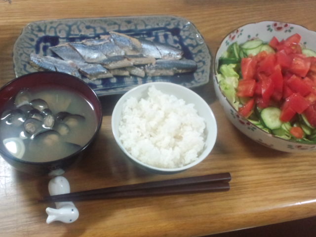サラダのでかさはお気になさらず。1人分なのであまりインパクト無いけどご飯炊いて、シジミの味噌汁作って、そして冷凍庫に入ってたトロサンマ~!!!