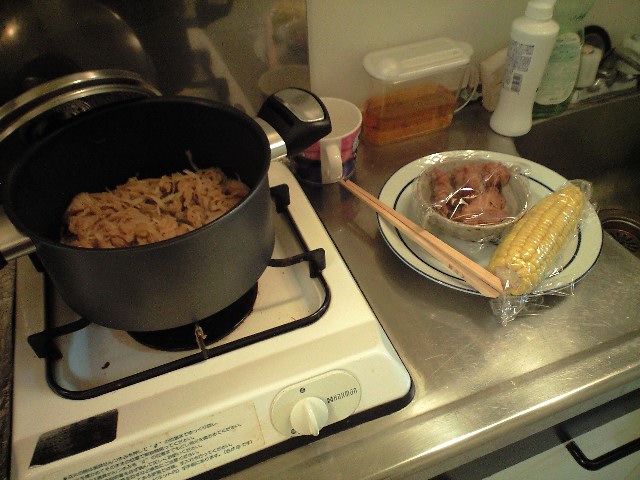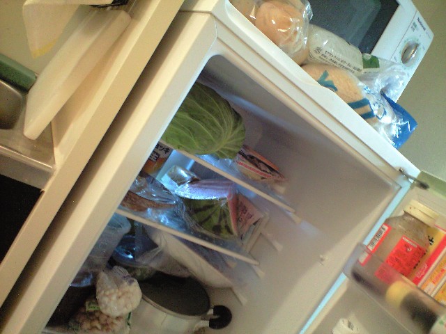 冷蔵庫に入れきれず溢れ出る食材たち。そして冷蔵庫にも鍋(シチュー)