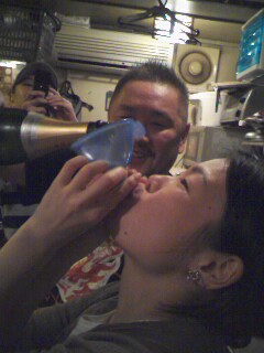 上向いて漏斗を口に咥え、約束のシャンパン投入!!