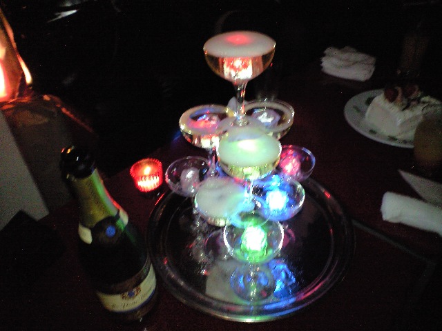 終盤に運ばれてきたケーキ、2人でケーキ入刀して、2人でシャンパンタワーにシャンパンを注ぎ……………