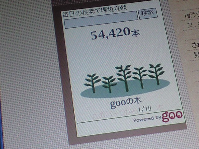 日々の様々な検索をgooのサイトで行うと、その収益の15%が環境保護に役立つというもの。(詳しくはアクセスしてみて下さいな)