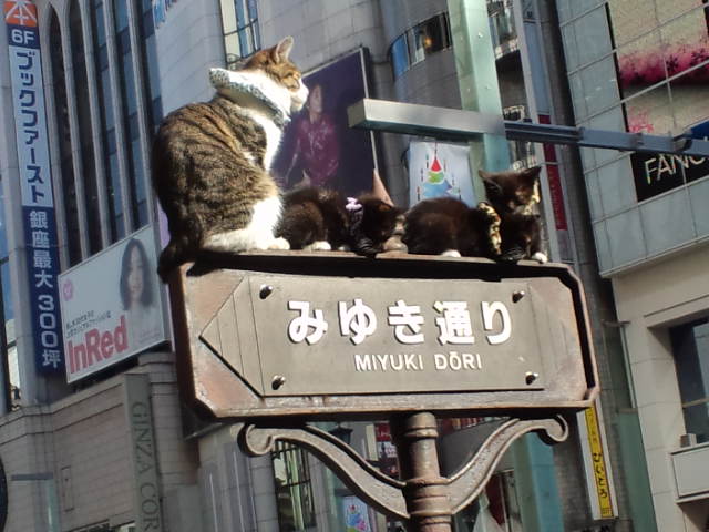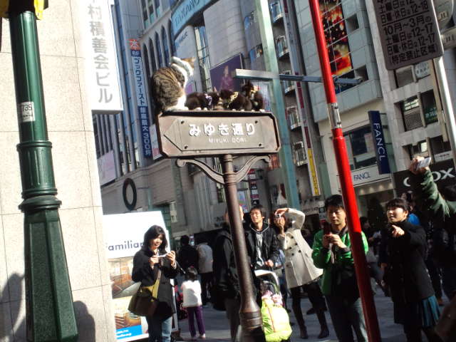 ☆銀座を歩いていたら人だかりが。よくよく見たらみゆき通りの看板の上ににゃんこ…!!!めっちゃ可愛い♪