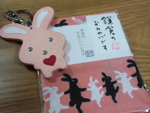 ☆鎌倉土産。自分用(笑)来年の干支がうさぎなもんで、可愛いグッズが多いこと多いこと…。その中で厳選した2つ。革製のキーホルダーとハンカチ!