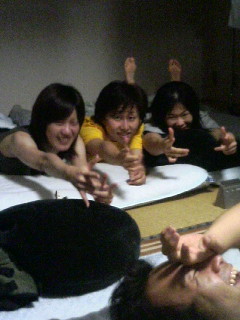 日付が変わる頃におとーさんが沈没。北海道から帰ってきたばっかりだしね、疲れも溜まっていたんでしょう。その後、夜中3時過ぎになると何人かが布団に入り始める。もちろんあたしも掛け布団ゲットして畳でごろ寝(笑)あとで聞いたら若手メンバー(聖哉、みやぢ、マキイチ君、ちこちゃん、JiNG君)は2時間位しか寝てなかったらしいです。さすがです(^^;)
