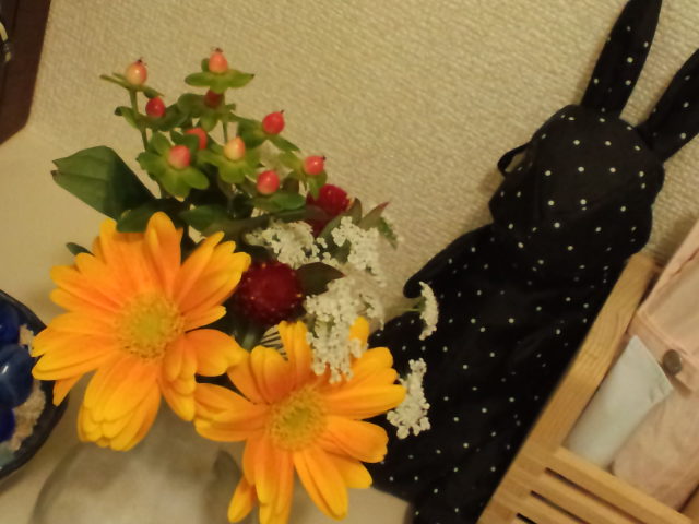 ☆大江戸線と小田急線の連絡通路の処のお店でお花購入♪玄関に飾ってます。(後ろの黒ウサギは折りたたみの傘です)