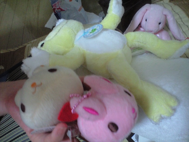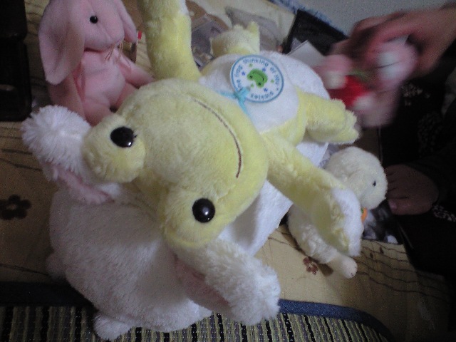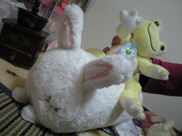 部屋にある、うさぎとカエルのぬいぐるみと戯れ。