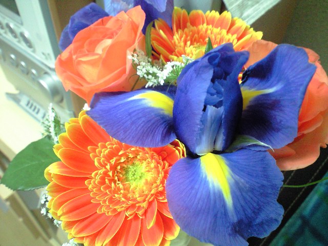 帰り道で見つけた菖蒲の入った花束を衝動買い。オレンジとブルーのコントラストが可愛い(^^)
